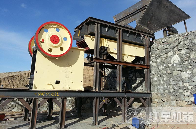 河卵石由給料機(jī)均勻地送進(jìn)粗破機(jī)(顎式破碎機(jī))中進(jìn)行初步破碎,破碎后的物料運(yùn)往下一階段;